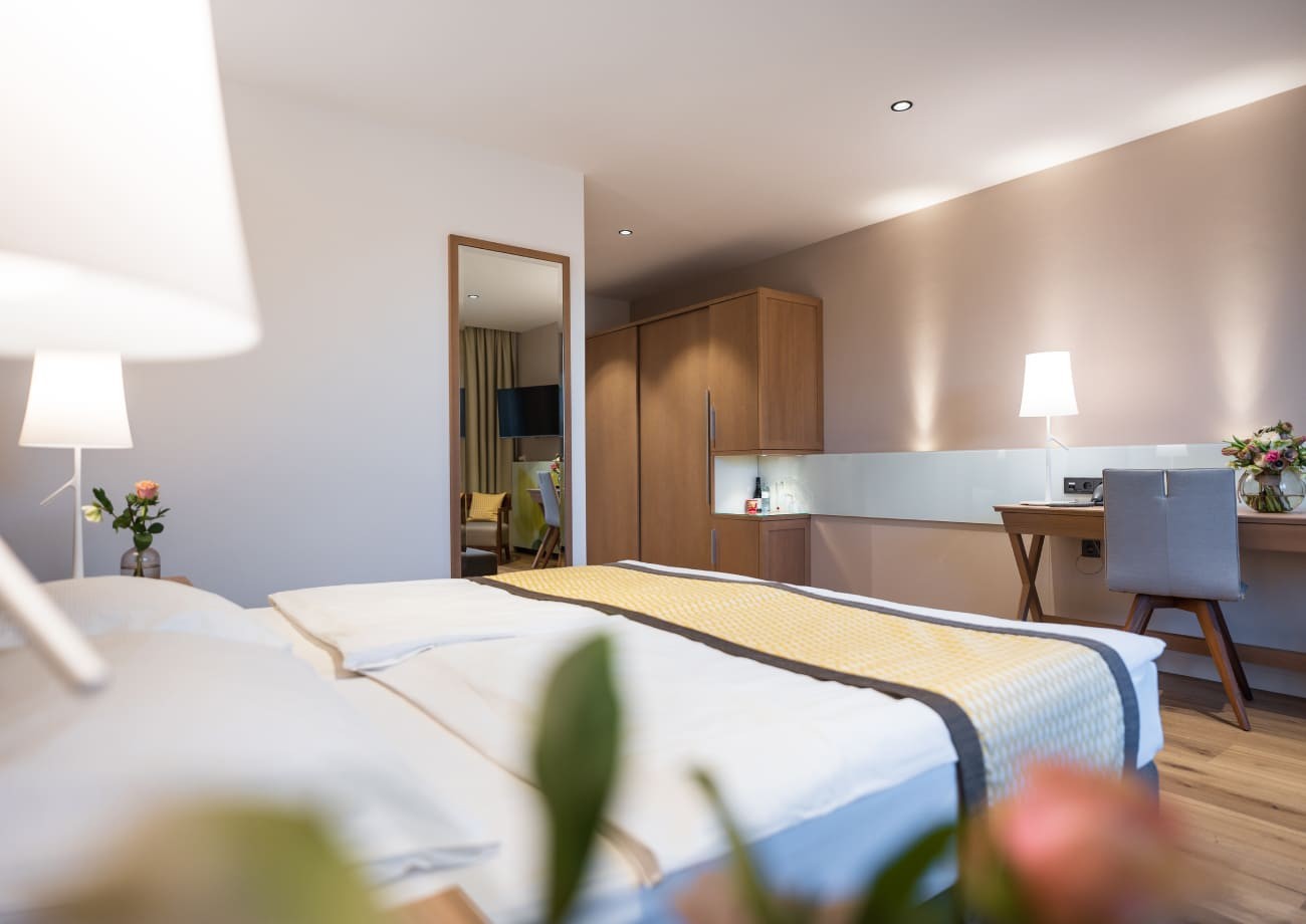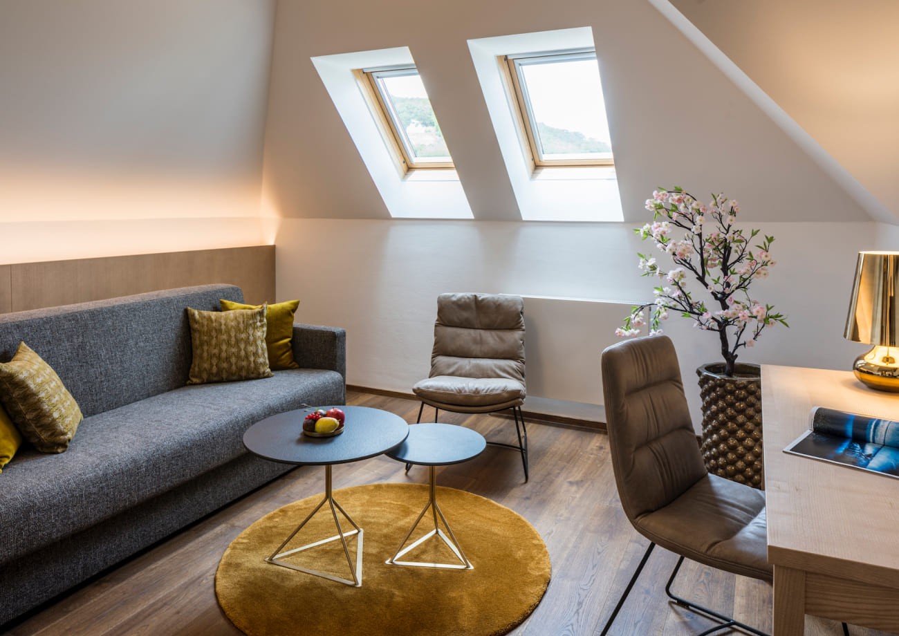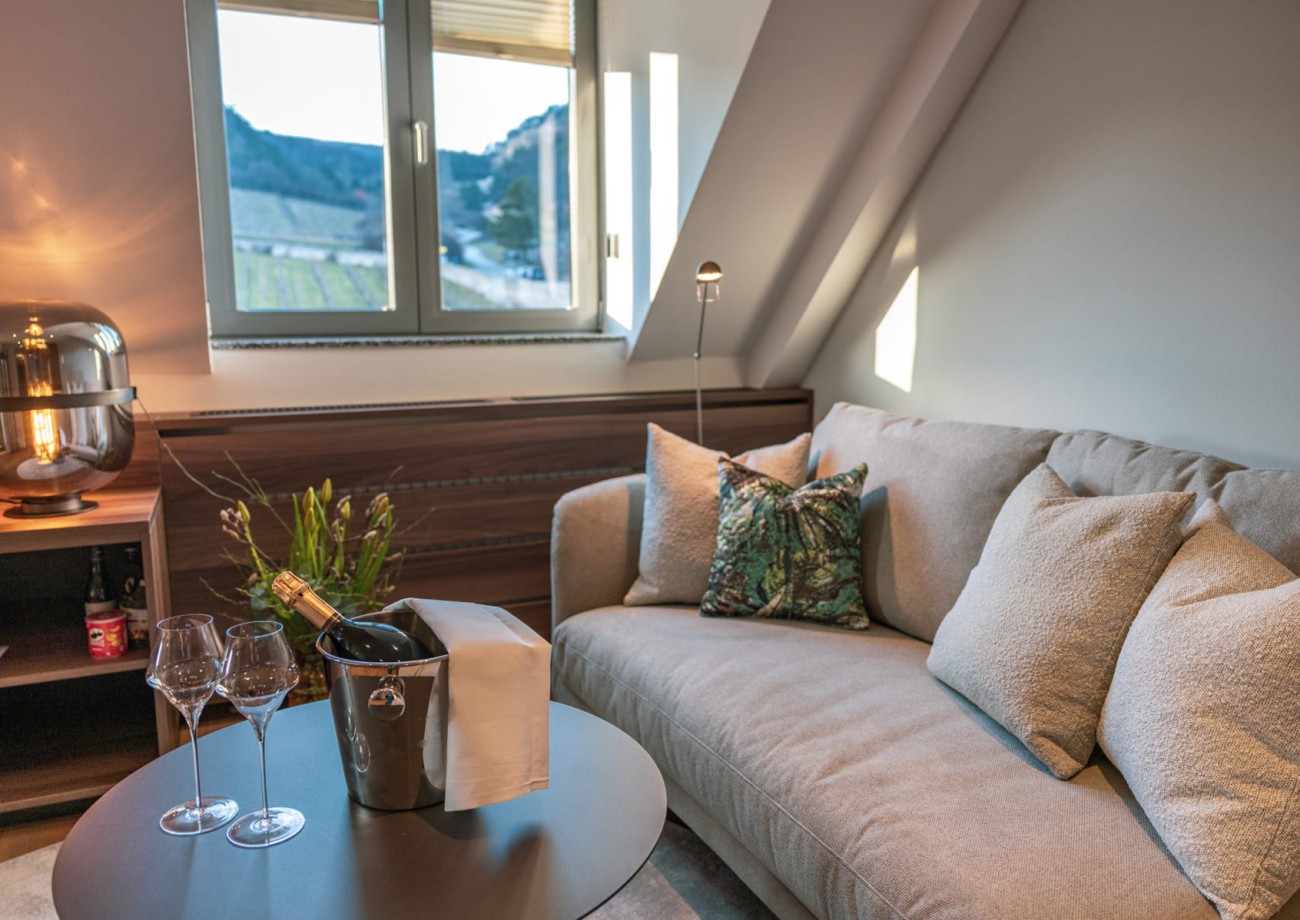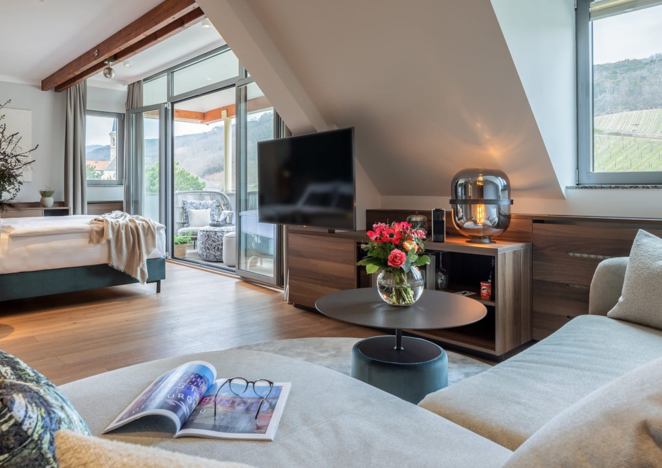 Occupancy: 1-4 persons / 55m² / Our spacious Vineyard Suite provides the highest comfort with a separate living room. Enjoy the picturesque view of the vineyards. This suite is ideal for families and offers 2 separate bedrooms with an additional sofa bed.