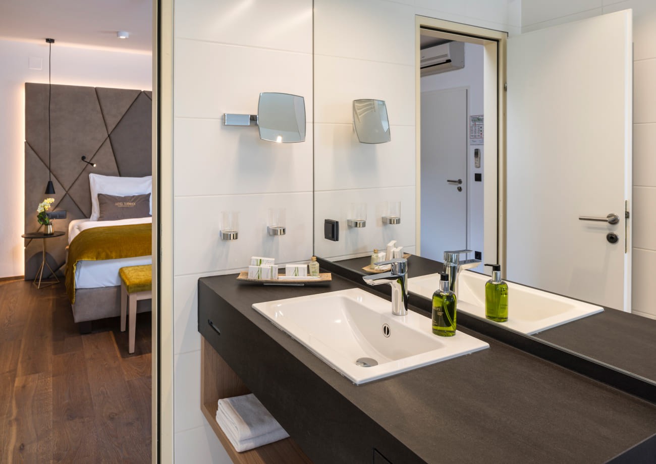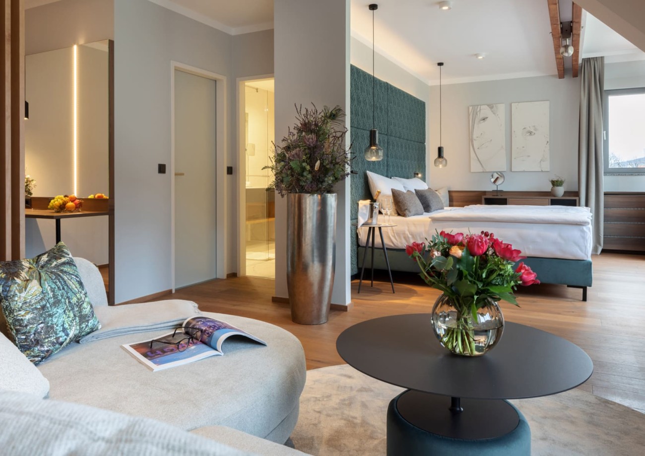 Occupancy: 1-2 persons / 30m² / Our spacious Turmhof Luxury room with balcony or terrace invites you to linger. The quiet location, the noble parquet floor, and the spacious box-spring bed offer the highest comfort.