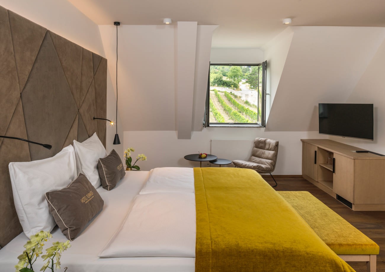 Occupancy: 1-2 persons / 60m² / No matter how lucky you are: In our Turmhof Suite with an extra-large bed, there is more than enough space to unfold. Enjoy your togetherness on romantic evenings on the private terrace overlooking the oldest vineyards of Gumpoldskirchen.