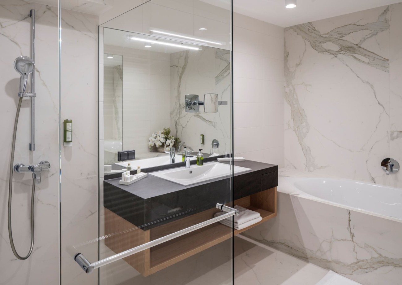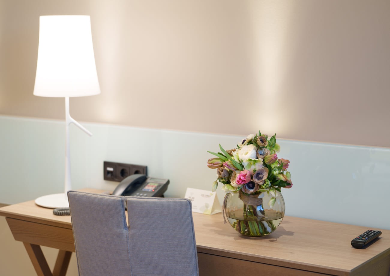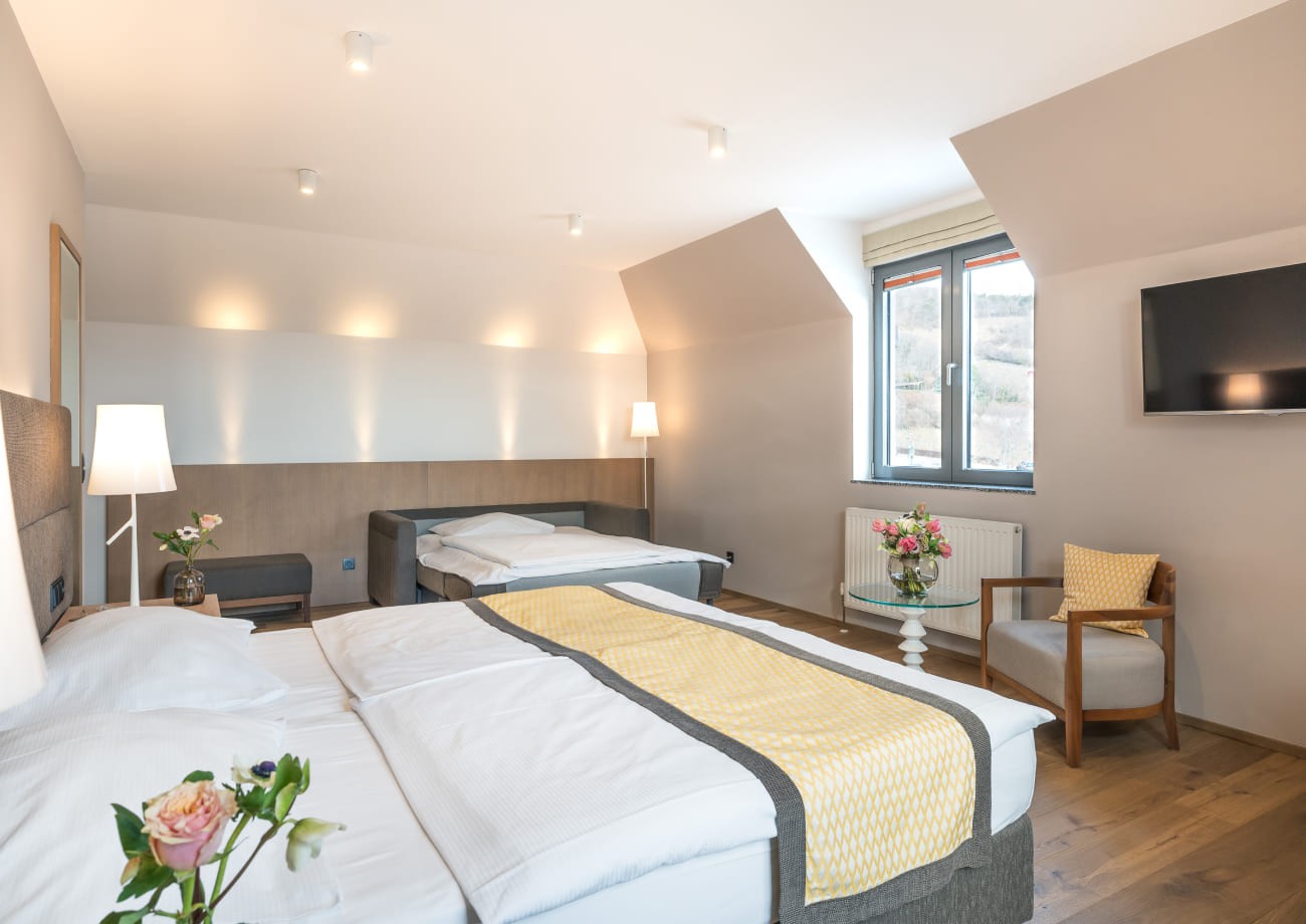 Discover our superior rooms and enjoy the wonderful view of the vineyards and the absolutely peaceful location. Warm earth tones, tasteful natural materials, and a dreamy bathroom await you!